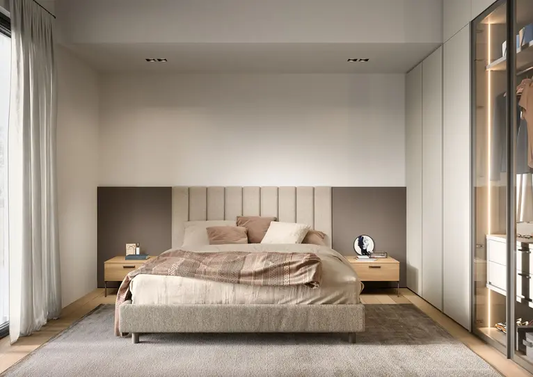 Upholstered or veneered headboards: Choose from soft fabrics, leathers, or premium veneers, shaped to your preference.